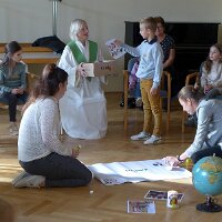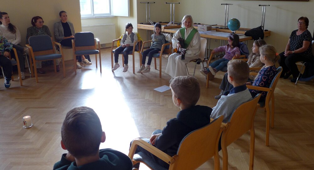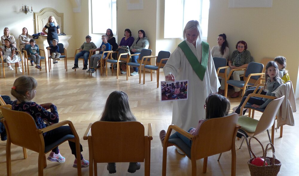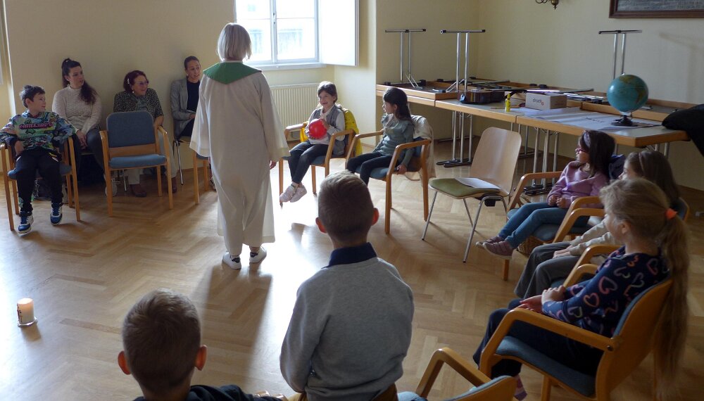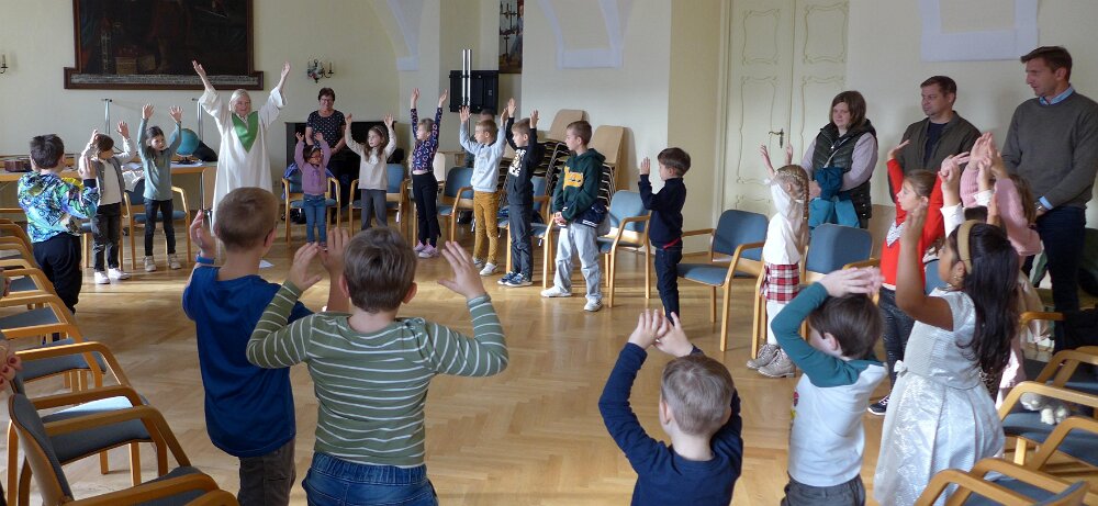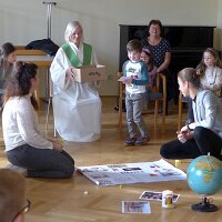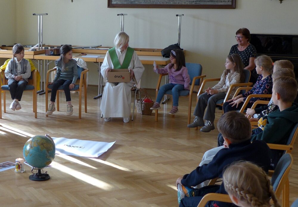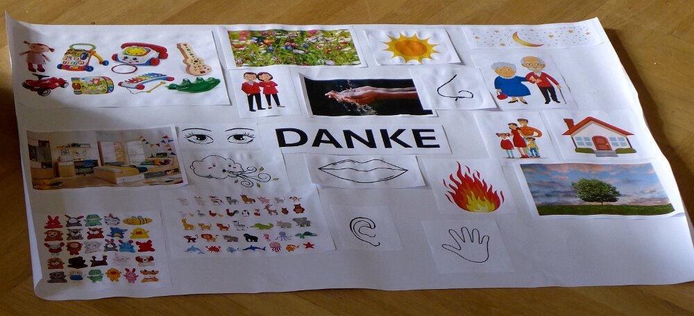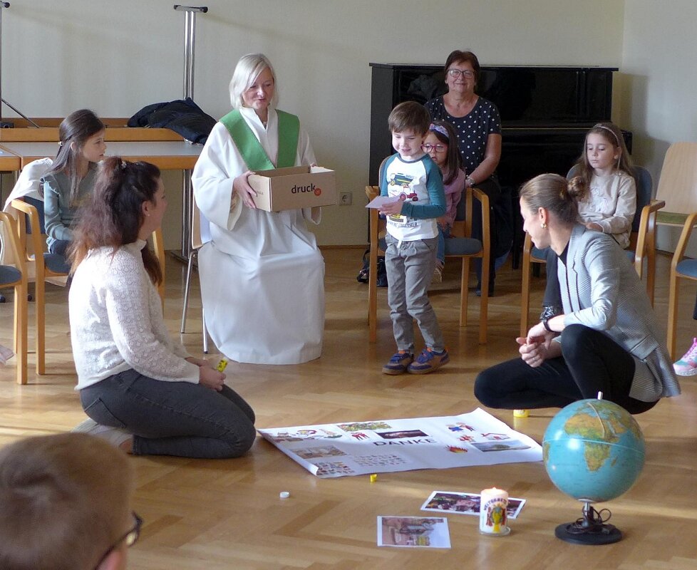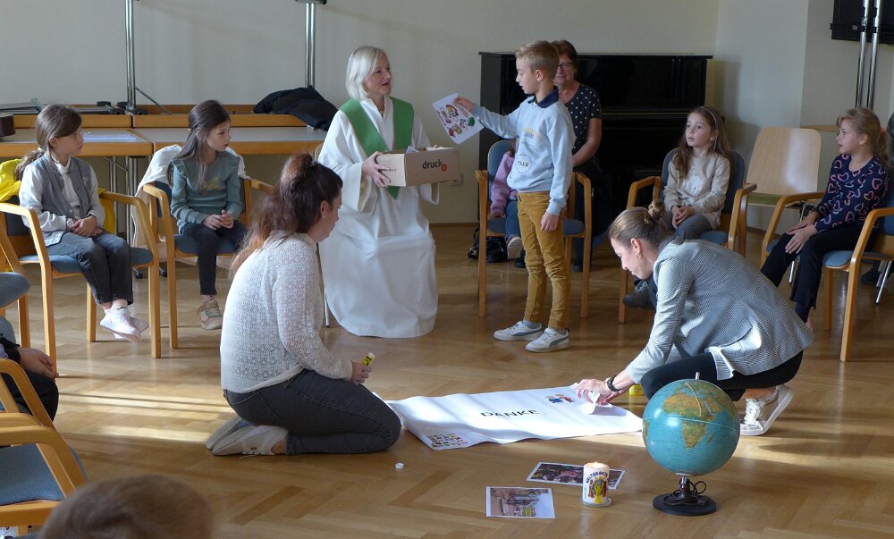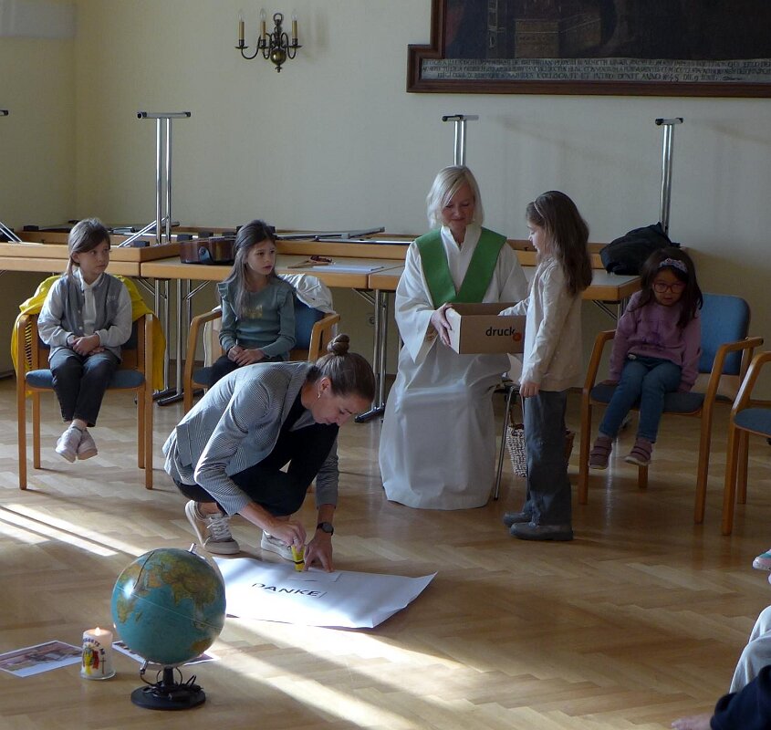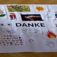 Im Kindergottesdienst überlegten wir, wofür wir dankbar sein können. Wir dachten auch an die armen Menschen im Südsudan, die heuer Beispielland für die Weltmission sind. Mit ihnen wollen wir verbunden sein, an sie denken, für sie beten und zugleich dankbar sein, dass es uns gut geht. Anschließend gestalteten wir eine Collage mit Bildern, für die wir dankbar sind.